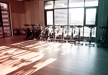 Allenamento cardiovascolare ad alta intensità su bike stazionarie con musica coinvolgente e istruttori motivanti.